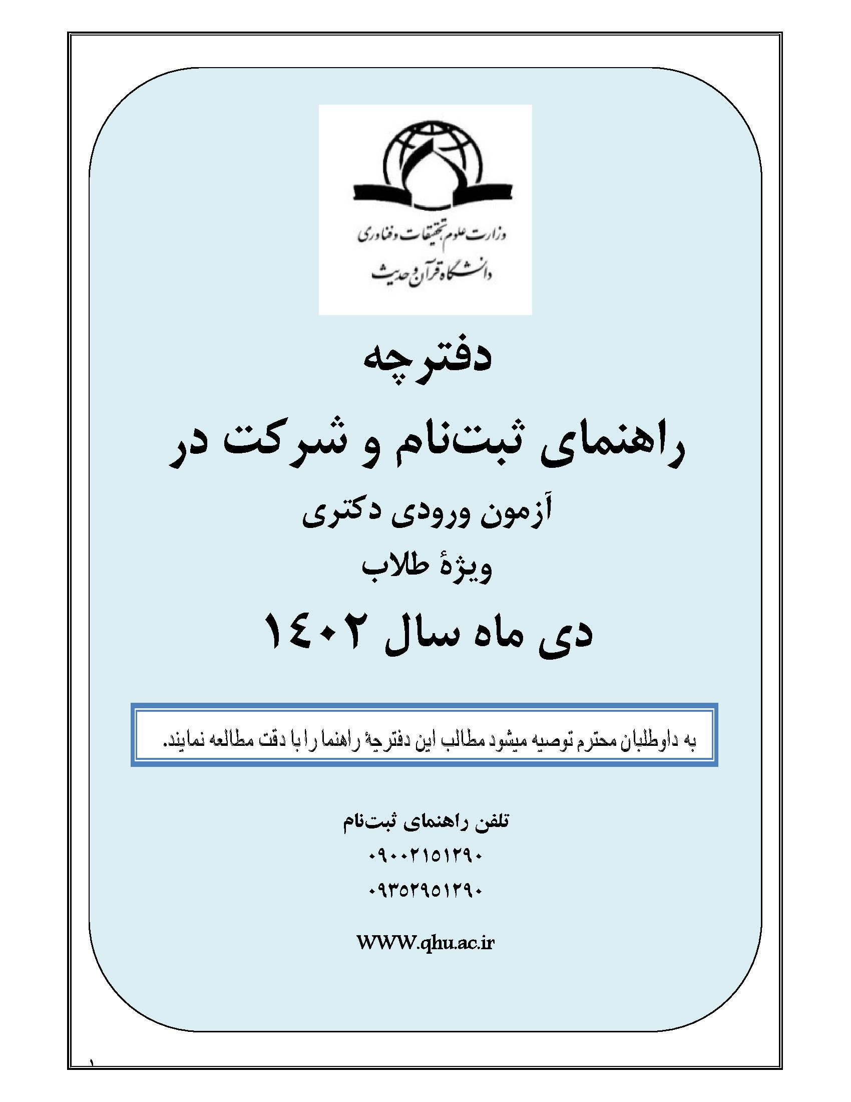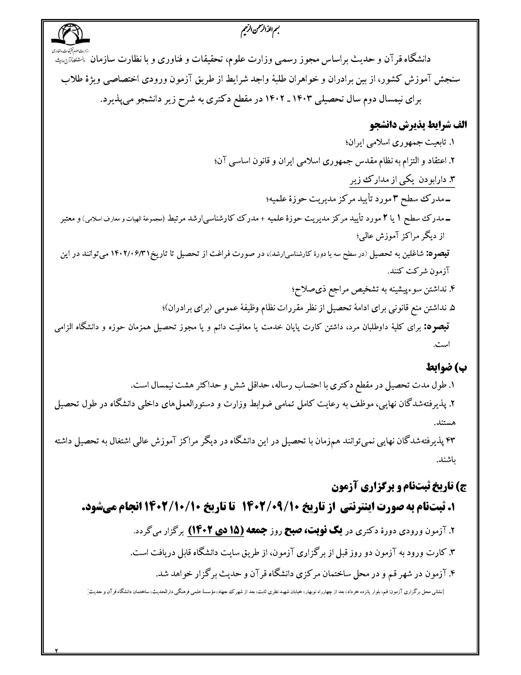 دانشگاه قرآن و حدیث برای اولین بار از طریق آزمون اختصاصی طلاب برای ترم بهمن1402در مقطع دکتری رشته «تفسیر امامیه» در قم دانشجو می پذیرد.