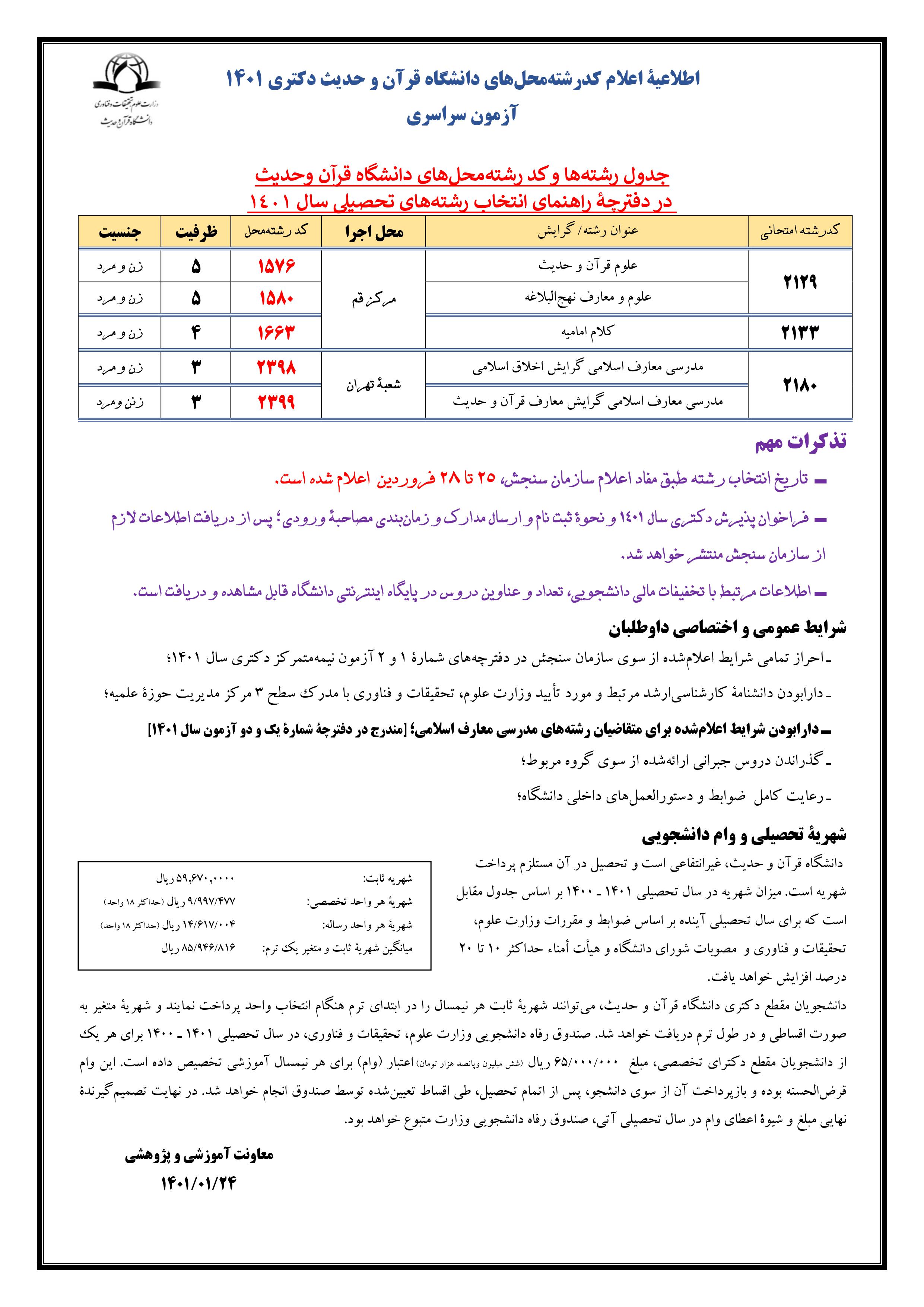 کد رشته محل های دکتری ١٤٠١ دانشگاه قرآن و حدیث