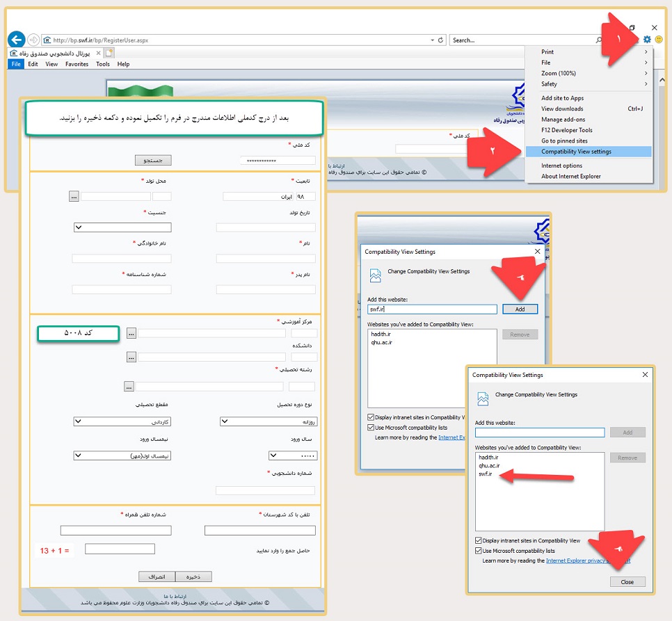 چنانچه دانشجویان گرامی در مراجعه به سایت با مشکل مواجه شدند لازم است راهنمای تصویری ذیل را با دقت مشاهده نموده و تنظیمات لازم را مطابق با تصویر زیر در مرورگر اینترنت اکسپلورر خود اعمال نمایند.