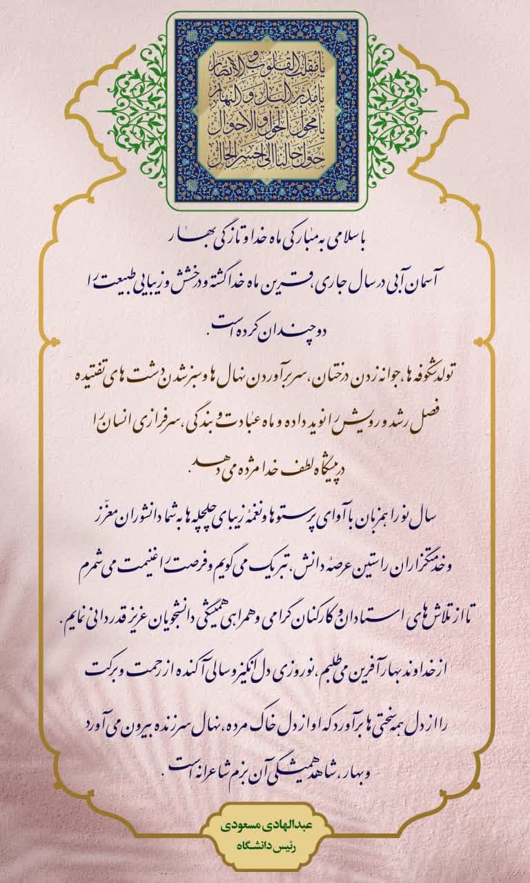پیام تبریک ریاست محترم دانشگاه جناب استاد مسعودی به مناسبت حلول سال نوی شمسی پیام تبریک ریاست محترم دانشگاه جناب استاد مسعودی به مناسبت حلول سال نوی شمسی گروه خبری : کد خبر : 572 کپی لینک کوتاه کلمات کلیدی