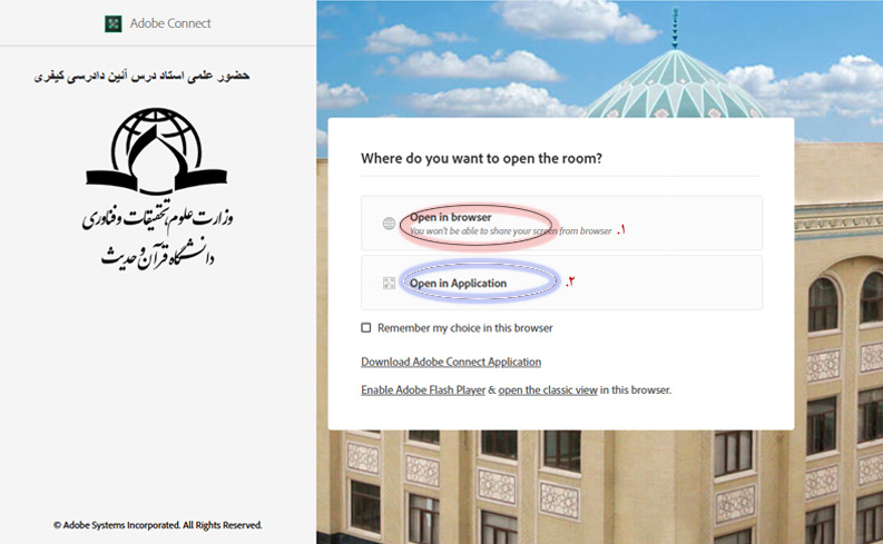 2. open in Application در صورت استفاده از این حالت، نیاز است که حتما اپلیکیشن adobe connect بر روی دستگاه شما نصب باشد.