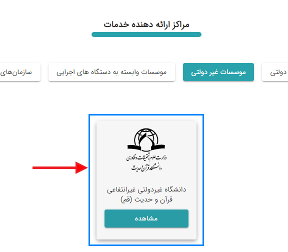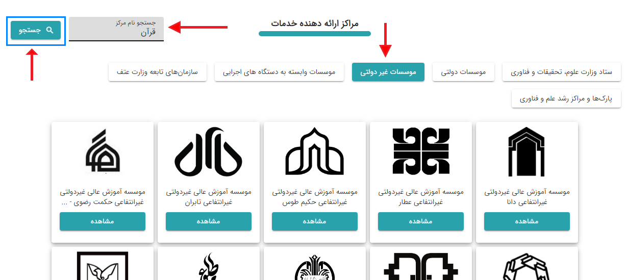9. در اواسط همین صفحه، در جایی که «مراکز ارائه دهنده خدمات» را مشاهده میکنید، در حالی که دستهبندی این قسمت روی سربرگ «موسسات غیردولتی» میباشد، در کادر جستجوی نام مرکز، عبارت «قرآن» یا «حدیث» را درج کنید، و سپس دکمه جستجو را بزنید.