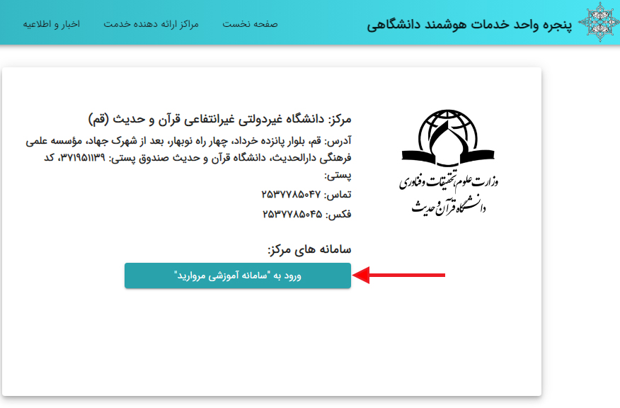 11. در حال حاضر وارد صفحه مربوط به دانشگاه قرآن و حدیث در پنجره واحد خدمات هوشمند دانشگاهی شدهاید. جهت ورود به نظام اطلاعاتی این دانشگاه در ابتدای صفحه، روی دکمه «ورود به "سامانه آموزشی مروارید"» کلیک کنید.