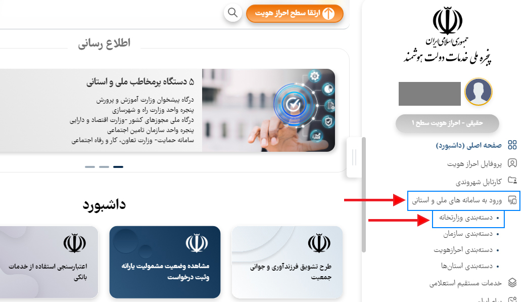 4. پس از ورود به سامانه، از بخش سمت راستِ صفحهای که مشاهده میکنید، منوی «ورود به سامانههای ملی و استانی» را کلیک کرده و سپس زیرمنوی «دستهبندی وزارتخانه» را انتخاب کنید.