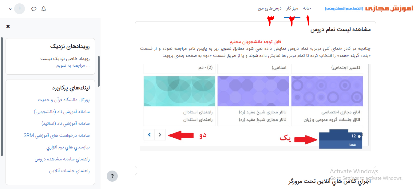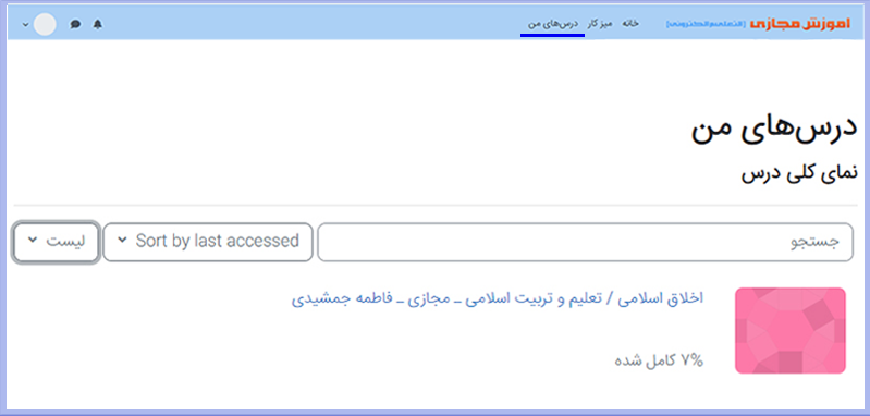منوی 3 درس های من: در این قسمت نمای کلی از اسامی دروس در دسترس می باشد و با کلیک بر روی نام هر درس وارد صفحه درس خواهید شد.