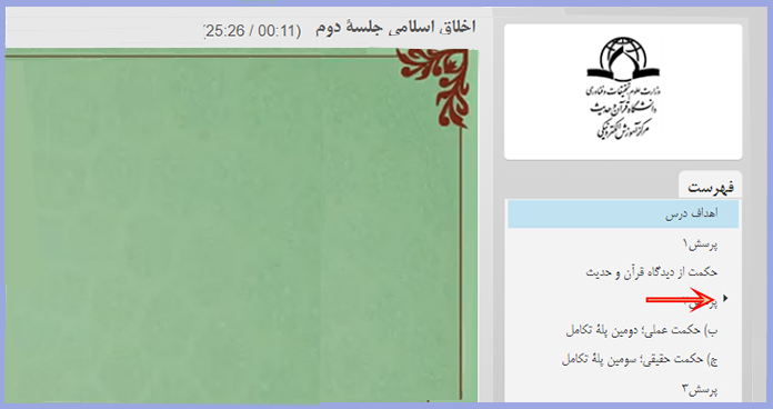 4. در صورتی که اعمال گفته شده در قسمت " ابزارها و تنظیمات لازم جهت مشاهده دروس " در همین راهنما را به درستی انجام داده باشید محتوای دروس در همین صفحه برای شما قابل مشاهده خواهد بود. در سمت راست کادر مربوط به نمایش درس، آیتم های هر جلسه قابل مشاهده است که با کلیک بر روی هر قسمت محتوای آن را می توانید مشاهده کنید. (تصویر 10)