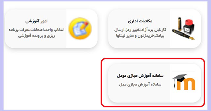 4- پس از ورود به سامانه مروارید بر روی گزینه سامانه آموزش مجازی مودل (تصویر 4) کلیک نمایید. پس از چند ثانیه وارد صفحه دروس خود در سامانه مشاهده دروس (مودل) می شوید. (تصویر 5)