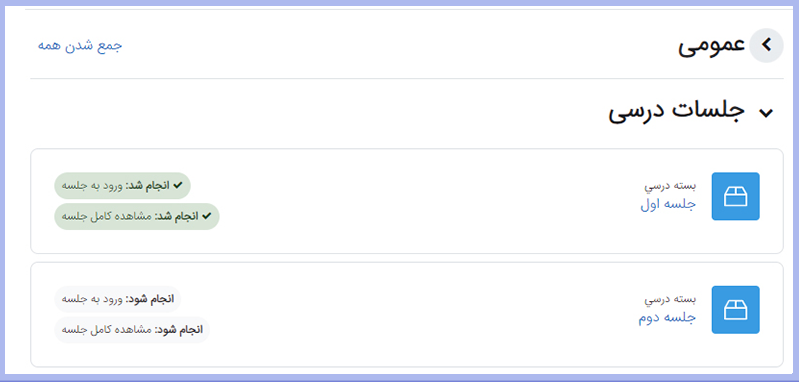 1. بعد از مشاهدۀ کامل جلسه درسی، در صفحه اطلاعات درس، در قسمتی که لیست کامل جلسات قراردارد، کادر مربوط به وضعیت مشاهده درس سبز رنگ می شود. ( تصویر 8)