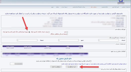 دانشجویانی که مایل به دریافت وام هستند میتوانند با مطالعه دستورالعمل زیر و مراجعه به آدرس http://bp.swf.ir/bp/RegisterUser.aspx نسبت به ثبت درخواست خود اقدام نمایند. شایان ذکر است اعطاء یا عدم اعطای وام مذکور تعهد مالی برای دانشگاه ایجاد نمیکند و مسئولیت تسویه حساب شهریه تحصیلی همچنان به عهده دانشجو خواهد بود. خواهشمند است قبل از ورود به سامانه ثبت نام، دستورالعمل ذیل را با دقت ملاحظه نموده و پس از آن نسبت به ثبت درخواست خود اقدام فرمایید.