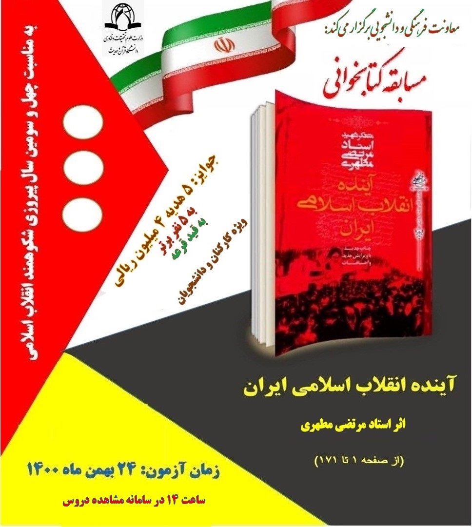 مسابقه کتابخوانی از کتاب «آینده انقلاب اسلامی» نوشته استاد شهید مرتضی مطهری ویژه دانشجویان وکارکنان دانشگاه قرآن وحدیث برگزار می‌کند.