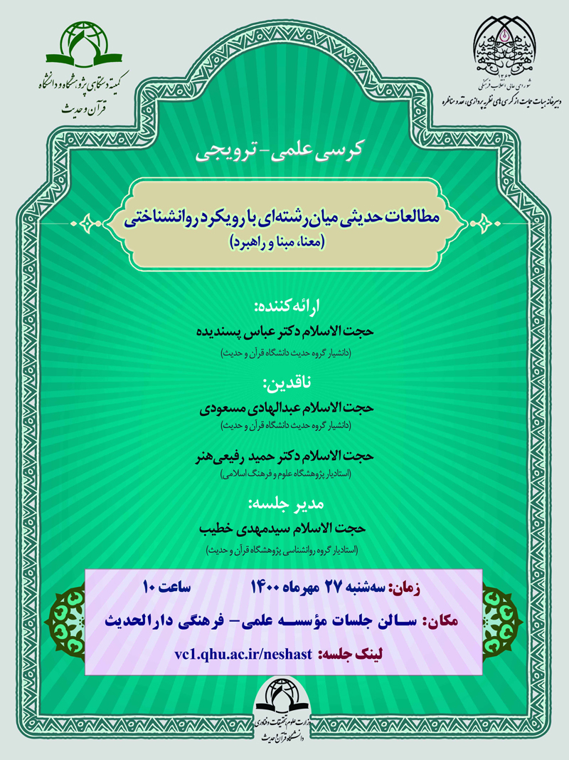 کرسی علمی ـ ترویجی نقد مطالعات حدیثی میانرشتهای با رویکرد روانشناختی(معنا، مبنا و راهبرد) سهشنبه ۲۷ مهرماه به صورت حضوری و مجازی برگزار میشود.