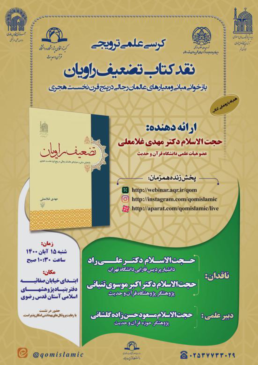کرسی علمی ترویجی با عنوان «نقد کتاب تضعیف راویان (بازخوانی مبانی و معیارهای عالمان رجالی در پنج قرن نخست هجری)»، روز شنبه ۱۵ آبان ۱۴۰۰ ساعت ۱۰:۳۰ برگزار میگردد. این کرسی مشترک میان «دانشگاه قرآن و حدیث» و «بنیاد پژوهشهای آستان قدس رضوی» است و همراه با رونمایی از این کتاب که اثر حجت الاسلام دکترمهدی غلامعلی از اعضای هیأت علمی دانشگاه قرآن و حدیث خواهد بود.