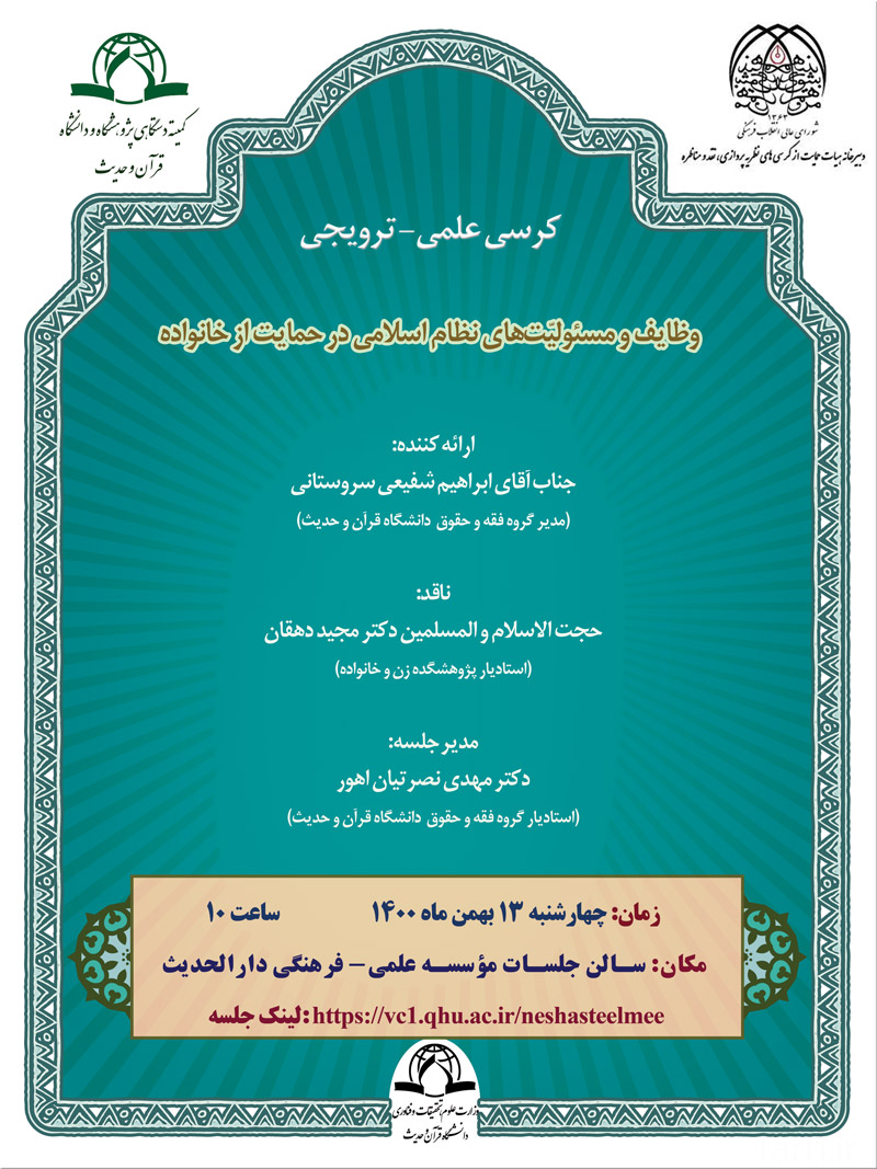 به اطلاع تمامی علاقمندان به ویژه دانشجویان دانشگاه قرآن و حدیث میرساند: در این نشست علمی جناب استاد ابراهیم شفیعی سروستانی(مدیر گروه فقه و حقوق دانشگاه قرآن و حدیث) روز چهارشنبه ۱۳/۱۱/۱۴۰۰، ساعت: ۱۰ به صورت حضوری و وبیناری در سالن جلسات مؤسسه دارالحدیث برگزار میگردد. جناب حجت الاسلام دکتر مجید دهقان (استادیار پژوهشکده زن و خانواده) به نقد این نشست خواهند پرداخت. مدیریت این جلسه نیز بر عهده جناب آقای دکتر نصرتیان اهور(استادیار گروه فقه و حقوق دانشگاه قرآن و حدیث) میباشد.