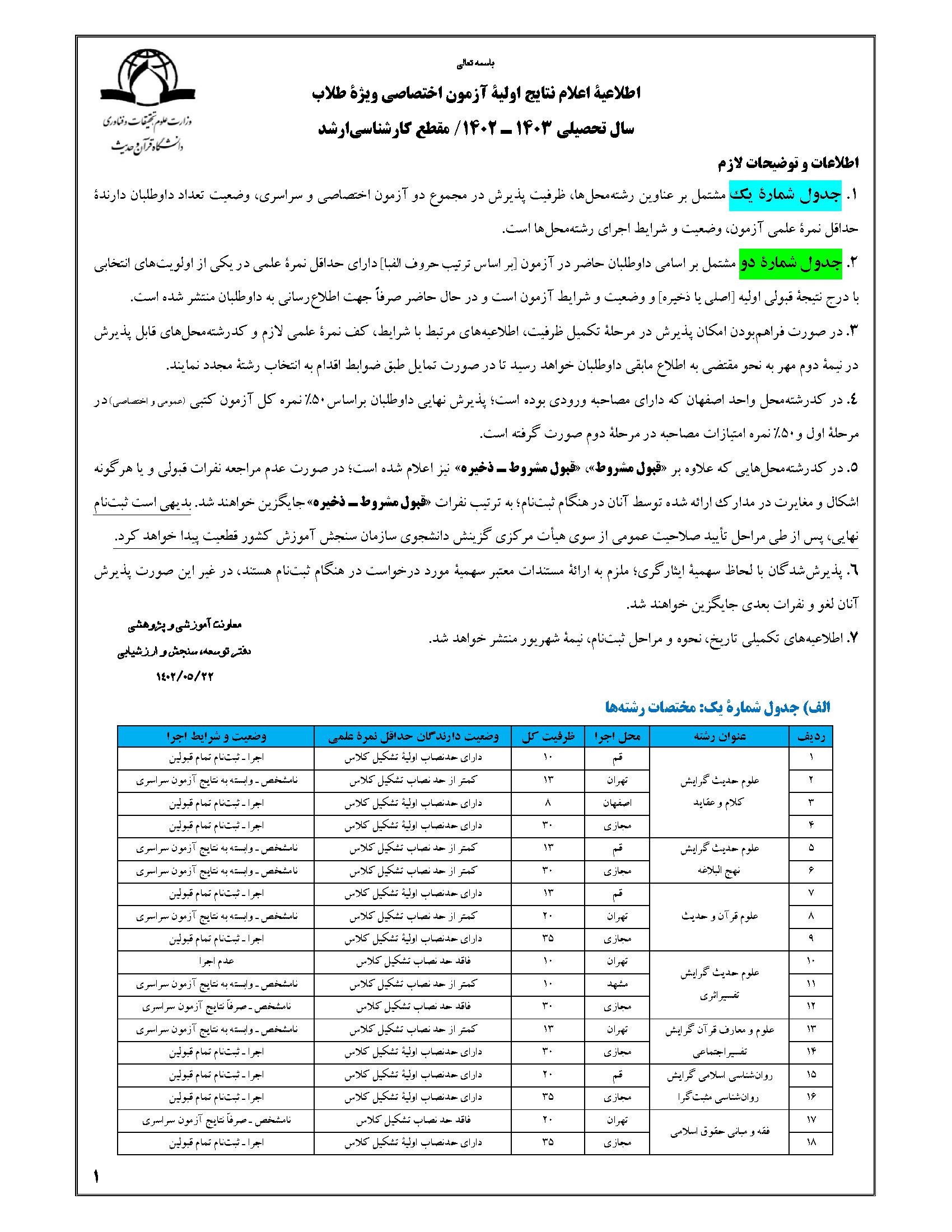 اطلاعیه اعلام نتایج آزمون اختصاصی کارشناسی ارشد طلاب