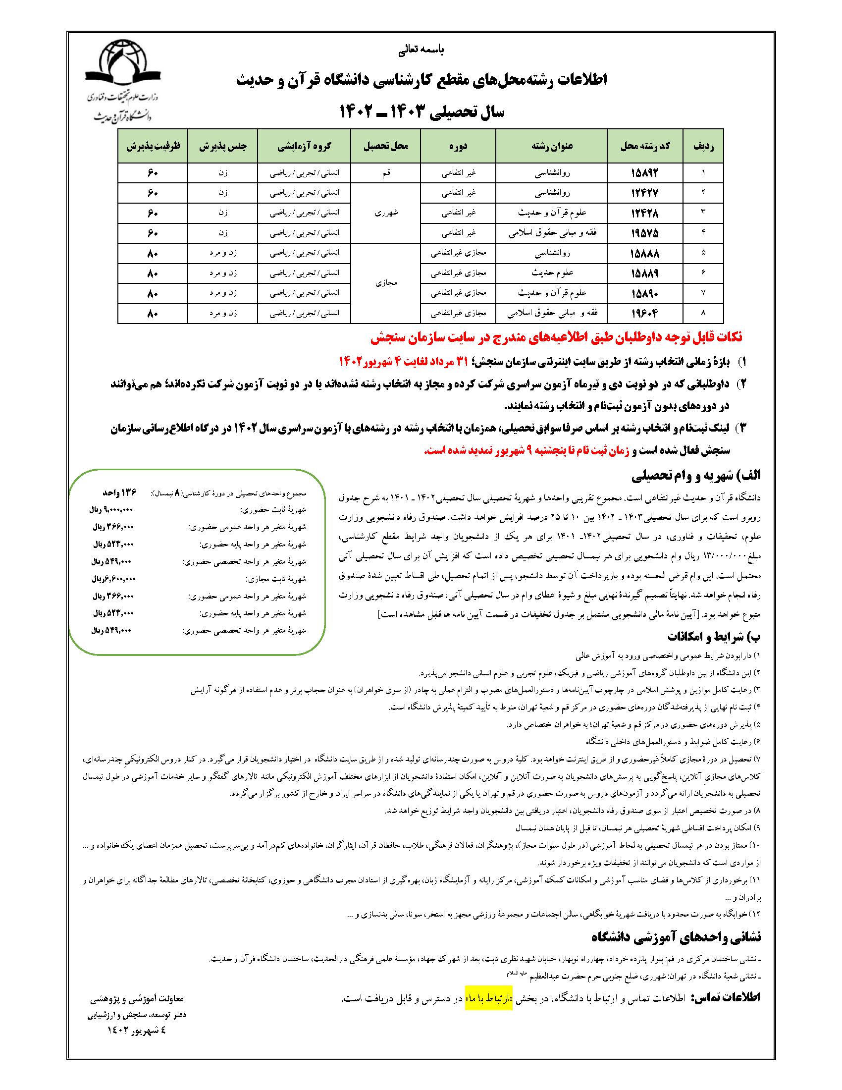 در این اطلاعیه کد رشته محل های حضوری و مجازی دانشگاه قرآن و حدیث، شهریه تحصیلی و امکانات و شرایط درج شده است و مهلت ثبت نام تا 9 شهریور ماه تمدید شد.
