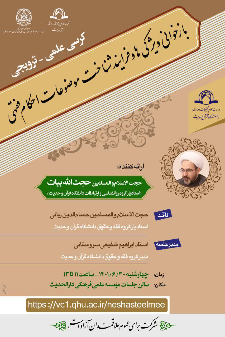 کرسی علمی - ترویجی با موضوع" بازخوانی ویژگی ها و فرایند شناخت موضوعات احکام فقهی" به صورت حضوری و آنلاین برگزار می شود.