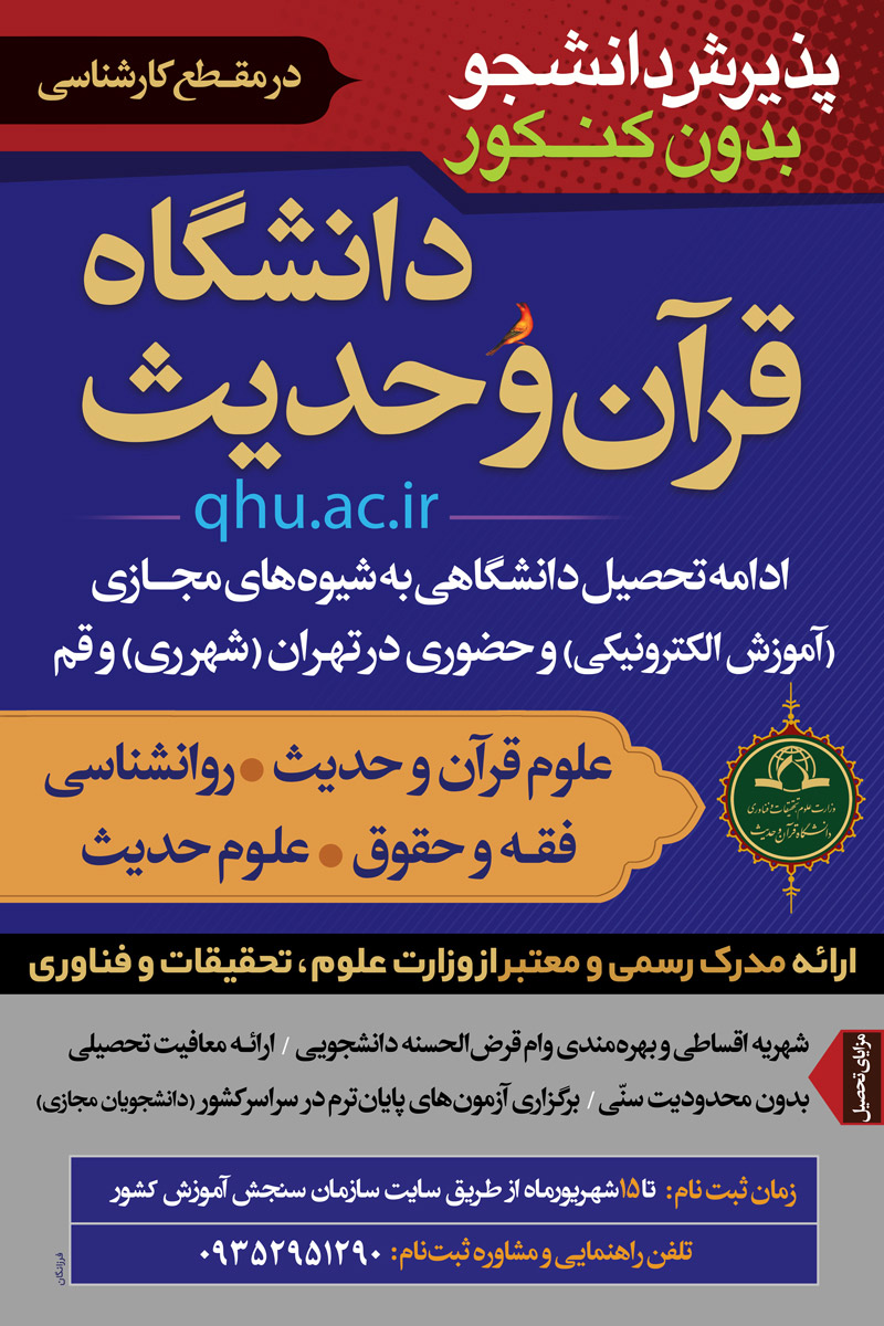 تمديد مجدد پذیرش دانشجو بدون کنکور در مقطع کارشناسی دانشگاه قرآن و حدیث