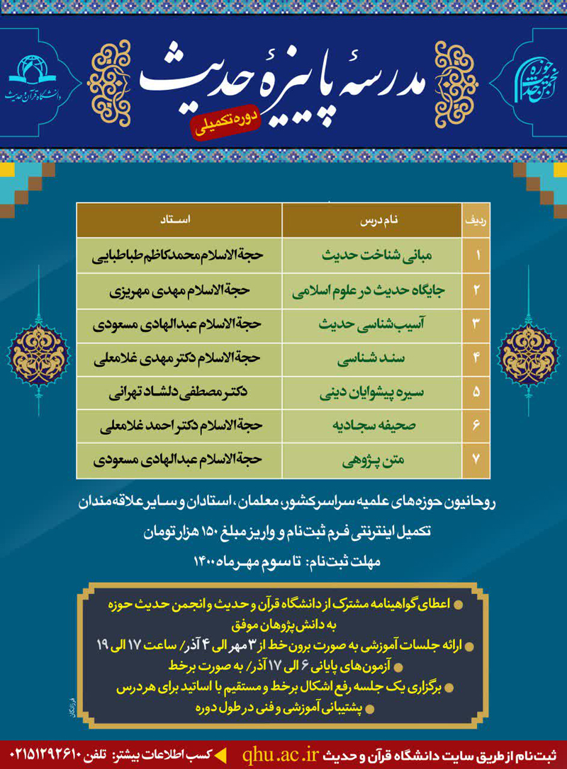 جدول زمان‌بندی ارائه دروس و آزمون‌های دوره مدرسه پاییزه حدیث (دوره تکمیلی)