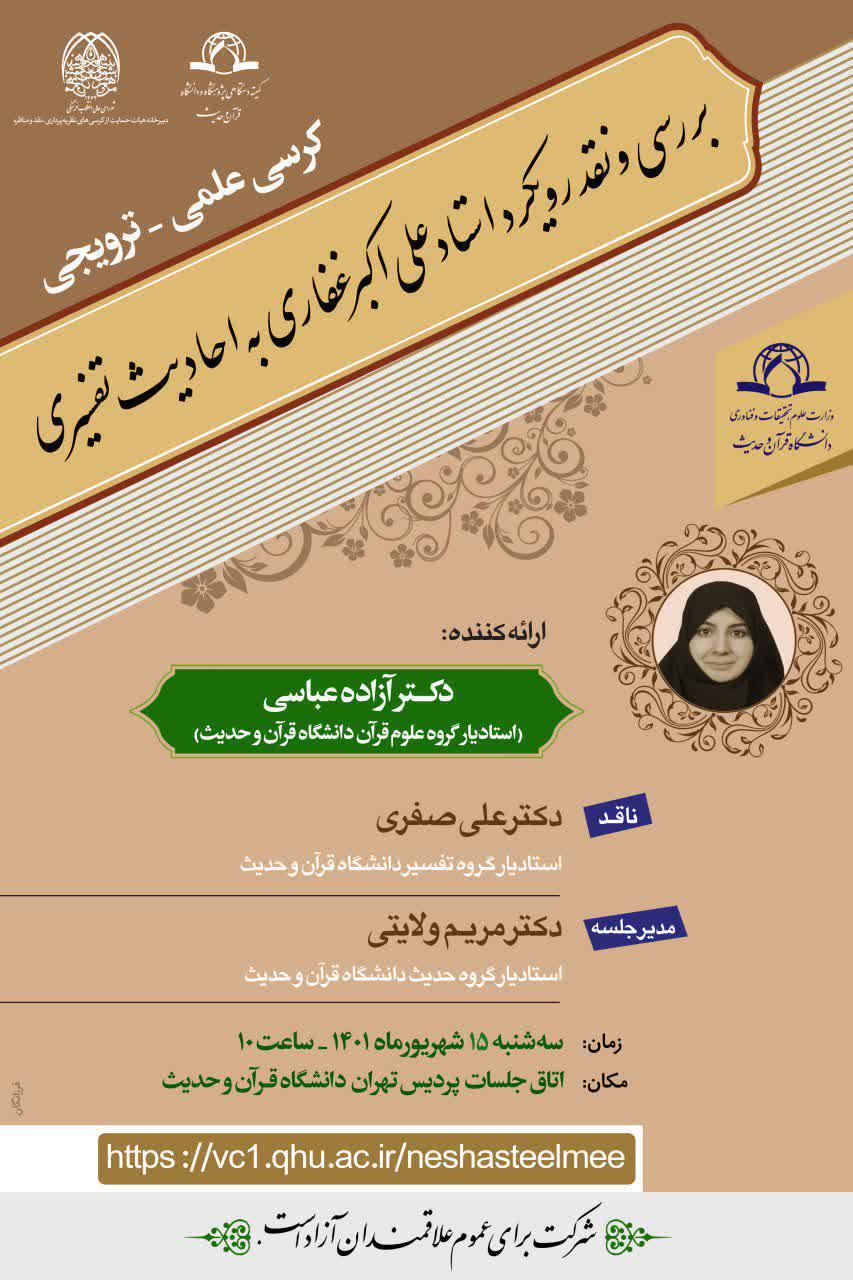 بررسی و نقد رویکرد استاد علی اکبر غفاری به احادیث تفسیری با ارائه دکتر آزاده عباسی، استادیار گروه قرآن دانشگاه قرآن و حدیث برگزار می شود.