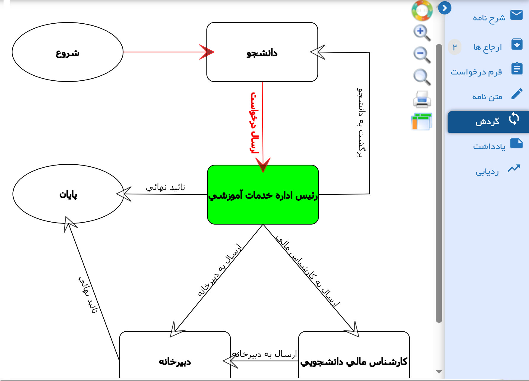 • در سمت راست فرم های درخواست منویی به نام «گردش» وجود دارد که بعد از ارسال نهایی درخواست توسط دانشجو، در صورتی که به کارشناس مربوط ارسال شده باشد، به رنگ سبز نشان داده می شود. مانند تصویر زیر: