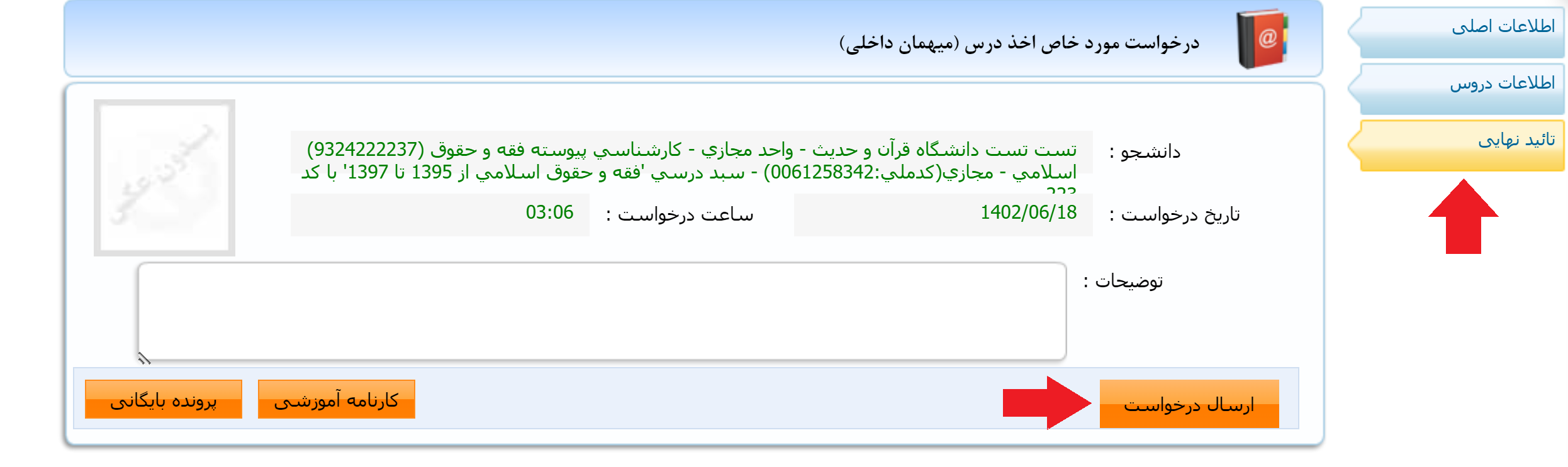 - بعد از ثبت درخواست، حتماً روی منوی «مرحله نهائی» در سمت راست صفحه کلیک کرده و دکمه «ارسال درخواست» زده شود. (تصویر زیر) در غیر این صورت درخواست ثبت نخواهد شد.