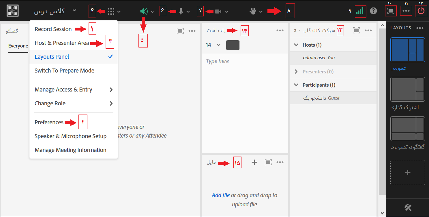 2- تنظیمات کلی کلاس (تنظیم میکروفون، وب کم، ...) 11- تنظیمات میکروفون و بلندگو، تغییر به حالت نسخه قبلی، تبدیل به حالت Application _________________________________________________