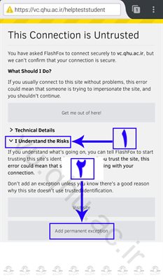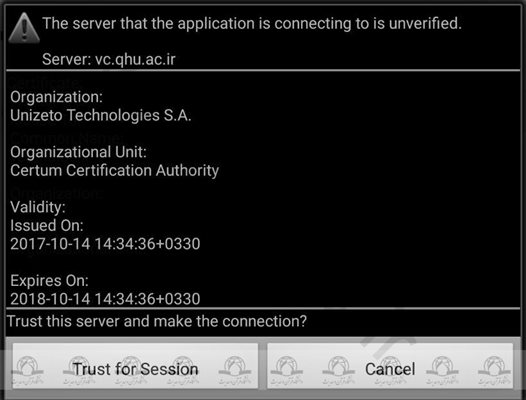 پیغام 6: در صورتی که بعد از ورود به کلاس بر روی دستگاه اندرویدی در نرم افزار connect با پیغام تصویر 10 در زیر مواجه شدید، دکمه Trust for Session را لمس کنید.