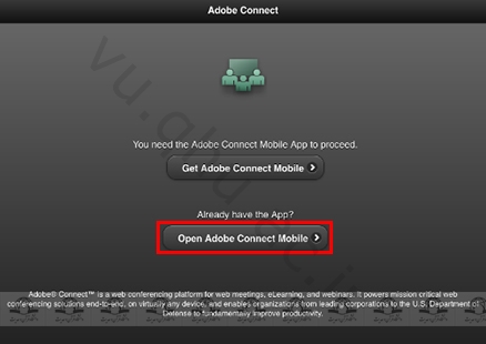2. open in Application در صورت استفاده از این حالت، نیاز است که حتما اپلیکیشن adobe connect بر روی دستگاه شما نصب باشد.