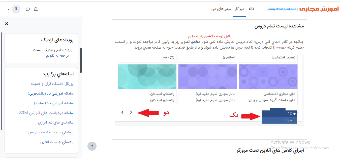 با توجه به دروس اخذ شده ی ترم جاری در زمان انتخاب واحد، لیست دروس در این بخش (نمای کلی درس) به نمایش در خواهد آمد. اطلاعات این قسمت، در منوی «خانه» نیز وجود دارد که با کلیک بر روی نام درس وارد صفحه ی درس می شوید.